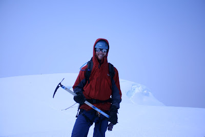 Finally – legs quaking – we round the top and see the summit. There’s another party finishing up there and we give them time. Then up we go to raise our arms and axes in victory and pose for photos. There’s not much of a view – the clouds are too dense – but we can see hints of the other ascents – a wicked balancing cornice on the north side, a steep vanishing drop to the west.